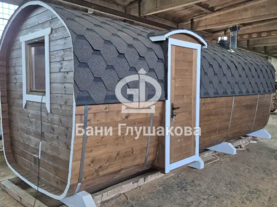 Дизайнерская баня бочка с длинным панорамным окном в длину крыши