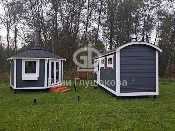Такая баня станет настоящим украшением вашего участка, добавив ему европейского шарма и функциональности. Представляете, как эффектно она будет смотреться на фоне зелени или зимнего пейзажа?