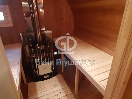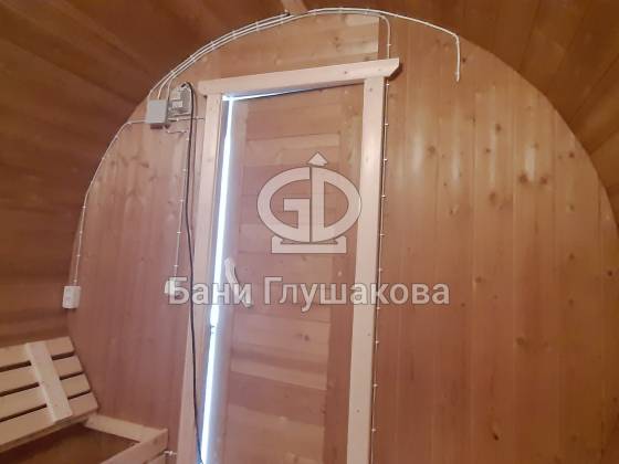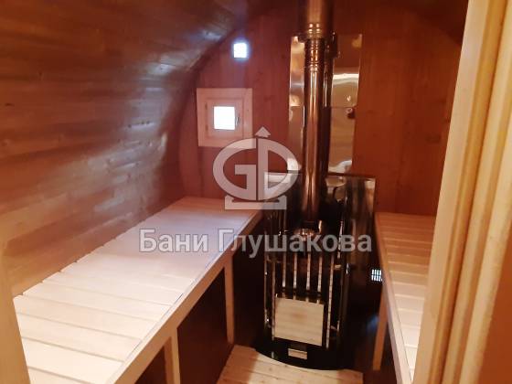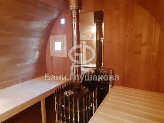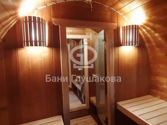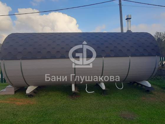 Эта круглая красавица — идеальный вариант для тех, кто ценит эстетику классической бани-бочки, но хочет получить современный комфорт и долговечность конструкции.