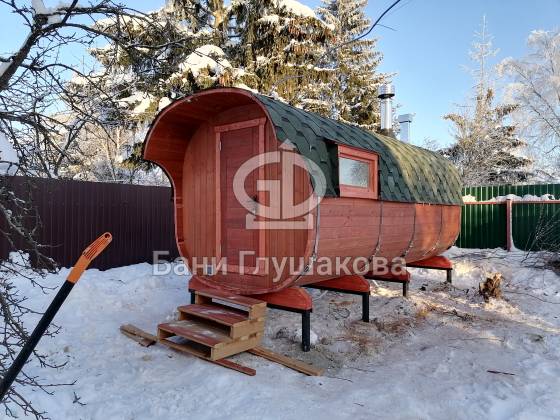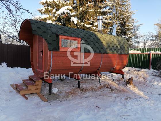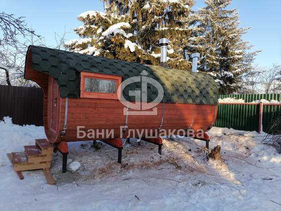 Комплектация: Баня установлена на надежный свайный фундамент, оснащена печью с баком для воды и полностью готова к эксплуатации сразу после монтажа.