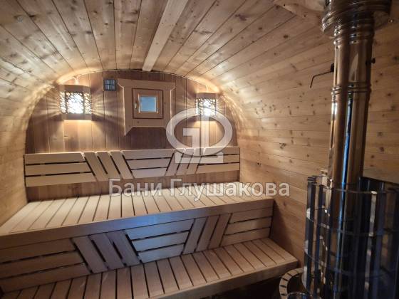 Квадратное сечение (квадро) дает заметно больше внутреннего объема и высоты потолков по сравнению с классическим кругом, поэтому внутри дышится легко и места хватает всем. Баня уже укомплектована фирменной печью, баком для воды и удобными полками — всё готово к первой протопке сразу после установки на участке.