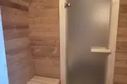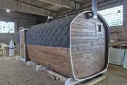 Баня сделана из бочковой термодоски, которая идеально подходит для строительства бань-бочек – она не набирает влагу и не рассыхается при смене сезонов. Подтягивать эту баню не нужно.