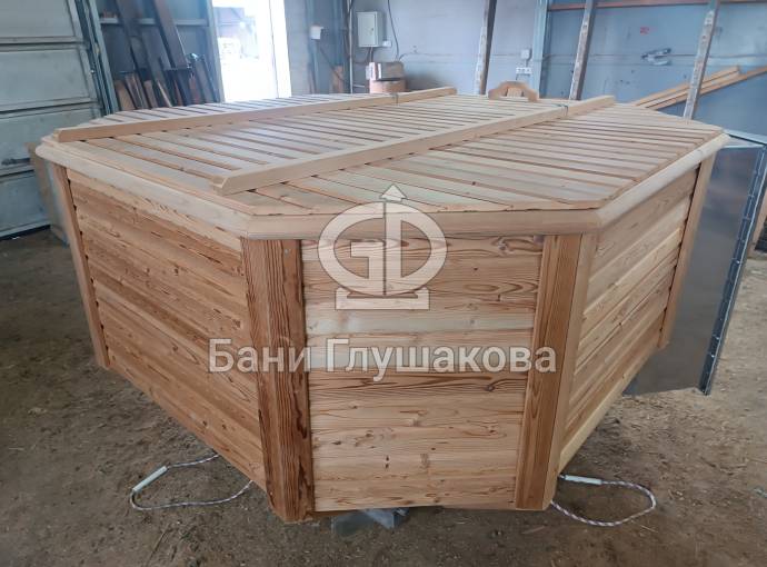 Снаружи купель обшита термомодифицированной вагонкой, которой не страшны сырость и палящее солнце. Материал по свойствам напоминает пластик.