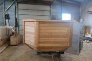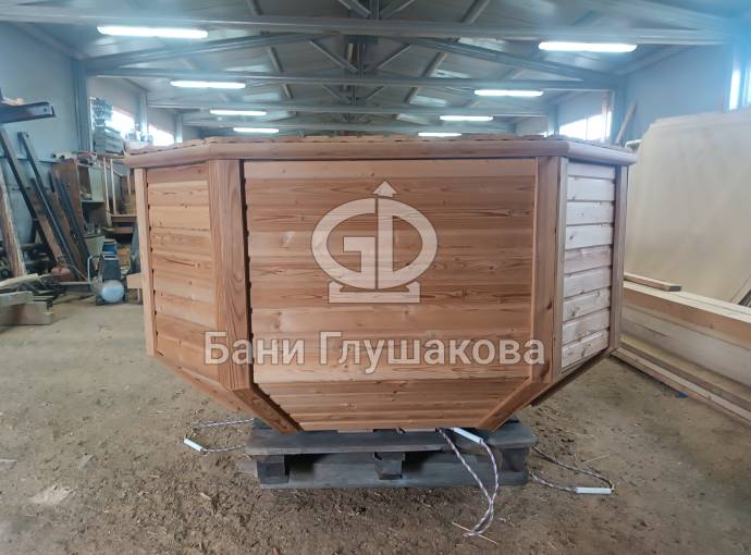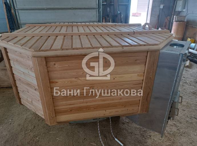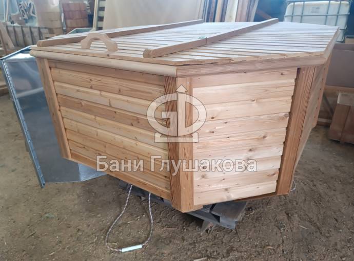 Снаружи купель обшита термомодифицированной вагонкой, которой не страшны сырость и палящее солнце. Материал по свойствам напоминает пластик.