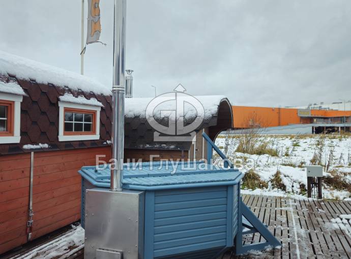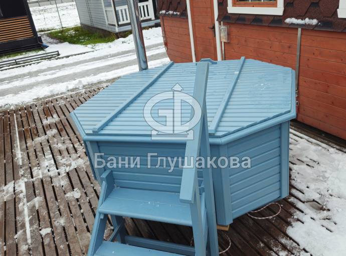 Снаружи купель обшита термомодифицированной вагонкой, которой не страшны сырость и палящее солнце. Материал по свойствам напоминает пластик.