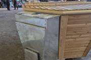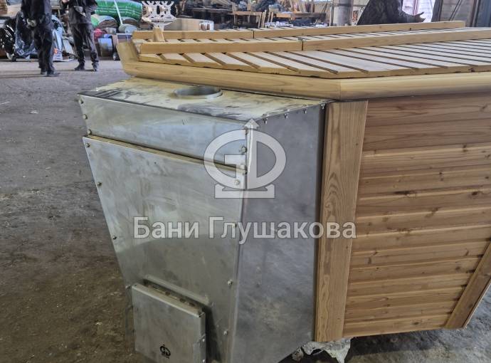 Снаружи установлена мощная встроенная печь нашего производства — она экономит место, быстро нагревает воду (за 2–3 часа) и легко снимается для ремонта или замены.