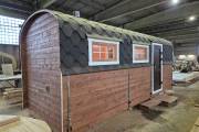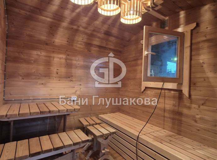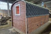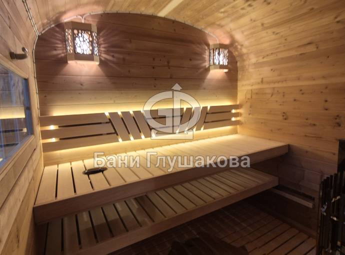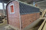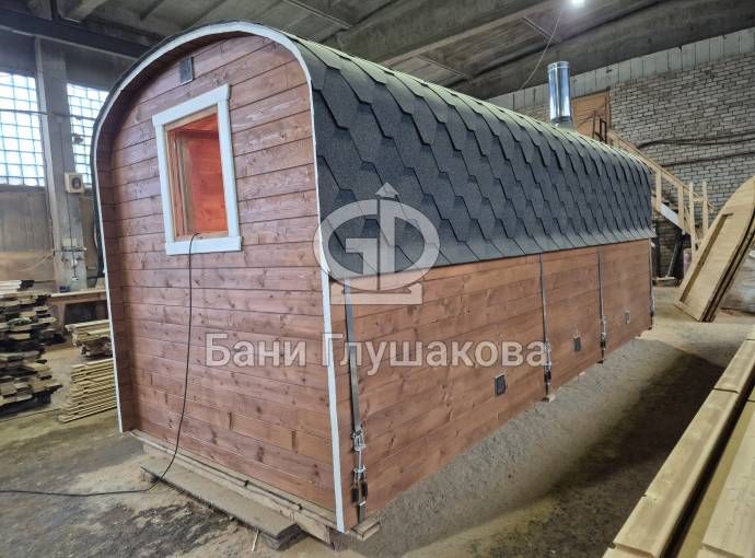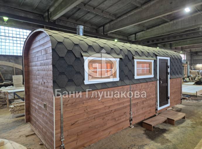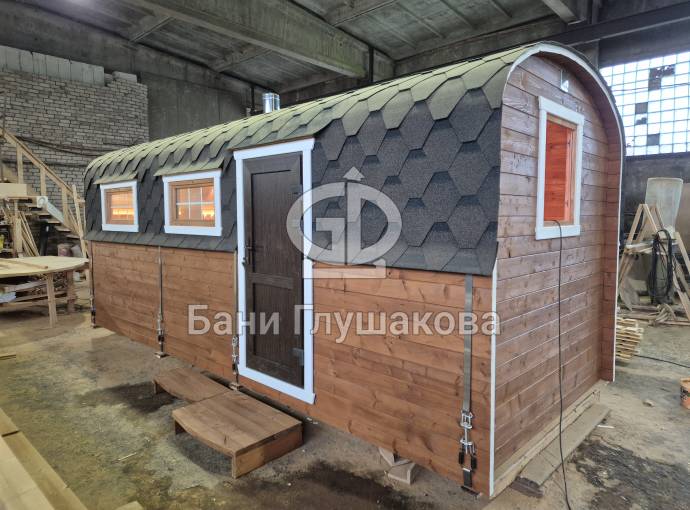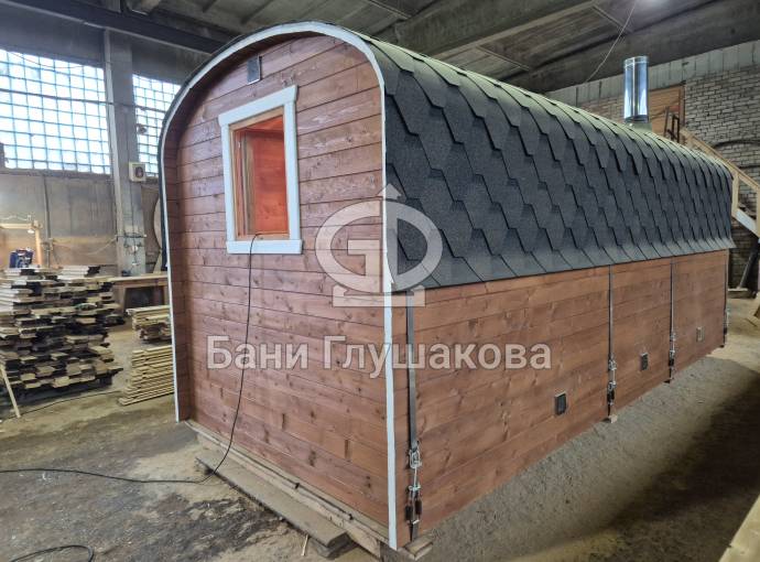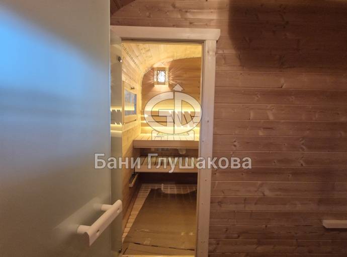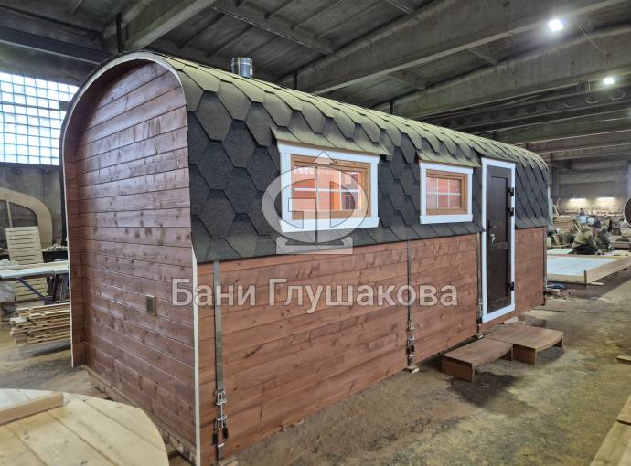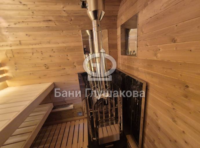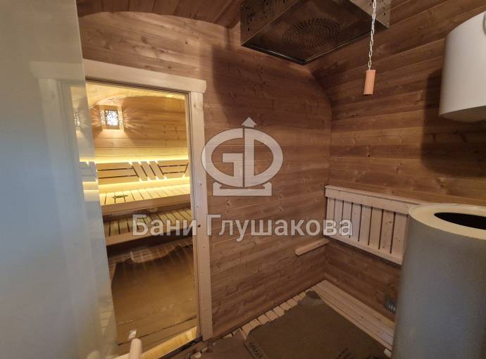 Баня выполнена из бочковой термодоски — материала, устойчивого к влаге, температурным перепадам и деформации. Такая конструкция остаётся лёгкой, но при этом тёплой и долговечной.