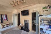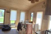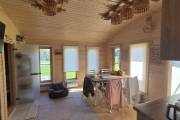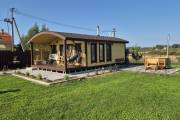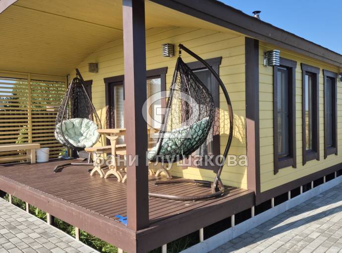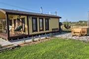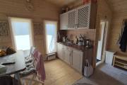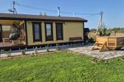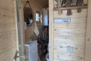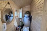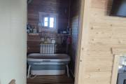 Есть отдельное душевое помещение: душ автономный, под трапиками пластиковый поддон, который защищает деревянный пол от сырости.
