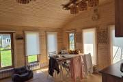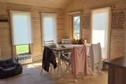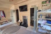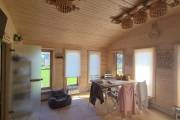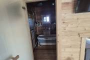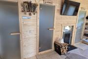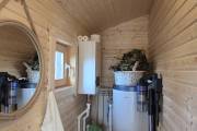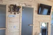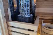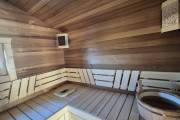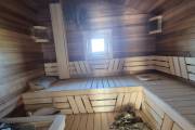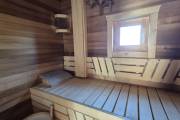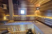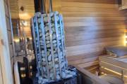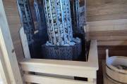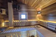 Сауна довольно просторная: тут стоят угловые двухъярусные полки, печь Костёр Relax (обнесена защитной конструкцией). Отделка полностью под ключ.