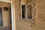 В комнате отдыха можно сделать на стене декоративное панно из спилов различных пород дерева, как на видео. Цена его с установкой 4000 р. Если баня брусовая то панно будет сделано выпирающим от стены, а если баня каркасная то панно встроено в стену и будет смотреться монолитно.