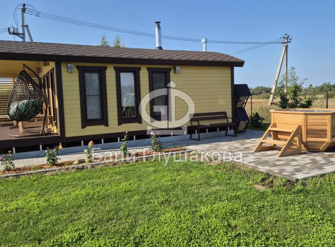 Эта баня построена по спецзаказу в ноябре 2021 года. За основу взят проект «Бурже». Строительство велось по каркасной технологии. Стильная обшивка по-глушаковски — сухая доска внахлёст «ёлочкой».