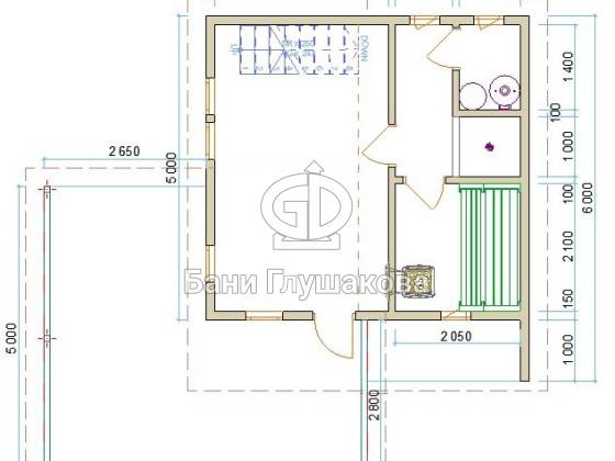 Проект был разработан в 2016 году и моментально стал самым продаваемым. Баню можно построить в каркасном или брусовом варианте. Авторское право №016-005986.